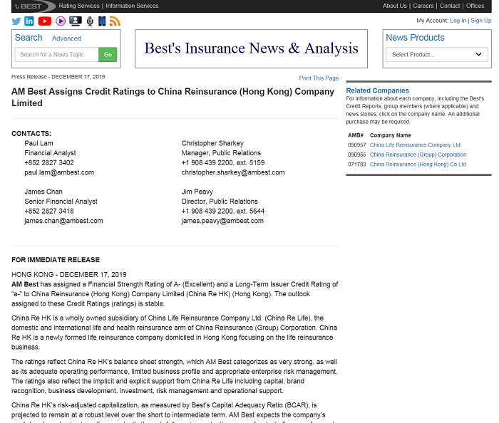 On Dec. 17, 2019(Beijing Time), A.M. Best has assigned a Financial Strength Ratings of “A-“ (Excellent) and a Long-Term Issuer Credit Ratings of “a-” to China Reinsurance (Hong Kong) Company Limited (China Re HK). The outlook assigned to these Credit Ratings is stable.